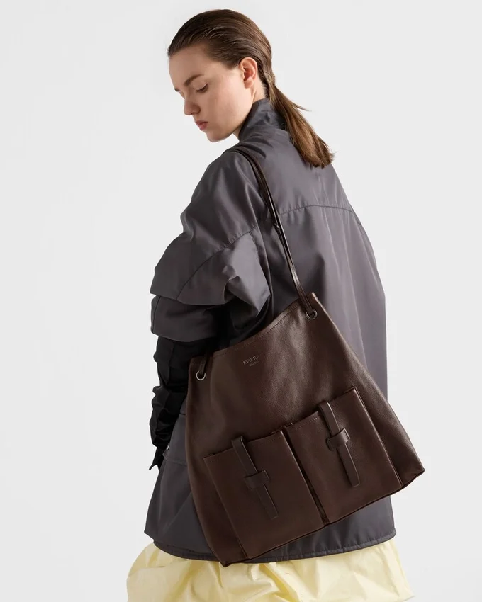 柔らかなボリューム感と洗練されたラインが特徴のこのバッグは、耐久性に優れたテクスチャーレザーを使用しており、力強く機能的な個性を放っています。広々としたシルエットは実用的で多用途なスタイルを体現しており、デザインを豊かに彩るユーティリティスタイルのディテールが際立っています。