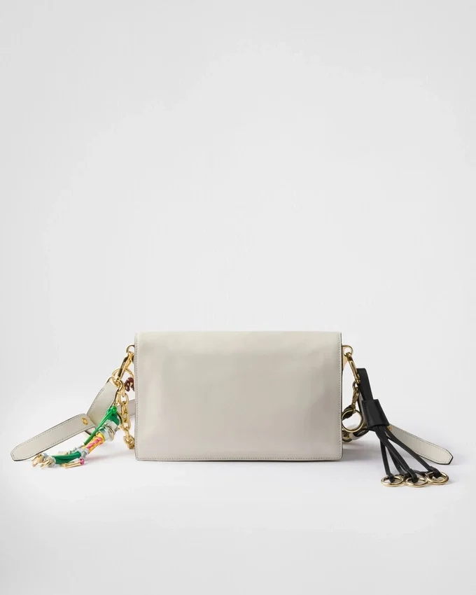 モダンで多用途な新しいPRADA Soft「ソフトサウンド」バッグは、レザー製でコンパクトな2室構造を採用し、ゴールドトーンの金具で仕上げられています。このアクセサリーは、遊び心とユニークなタッチを添える様々な取り外し可能なバッグチャームが特徴です。