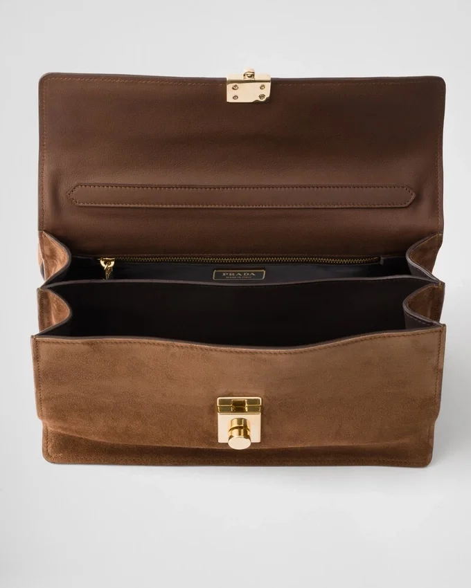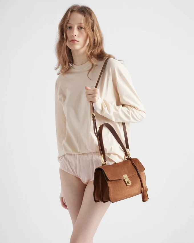 堅牢でフォーマルなワークバッグからインスピレーションを得たこのアクセサリーは、クラシックなオフィスシルエットを新たな姿勢で再解釈しています。スエードのビロードのような手触りで柔らかさを加えた典型的なフォルムは、洗練されたフェミニンなディテールで彩られています。 アーカイブから採用された縦型の留め具が、ショルダーに掛けられる長いハンドルが特徴のこのアクセサリーを引き立てています。