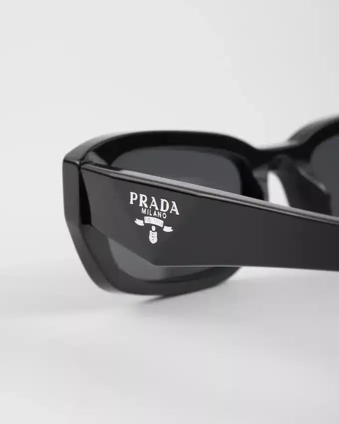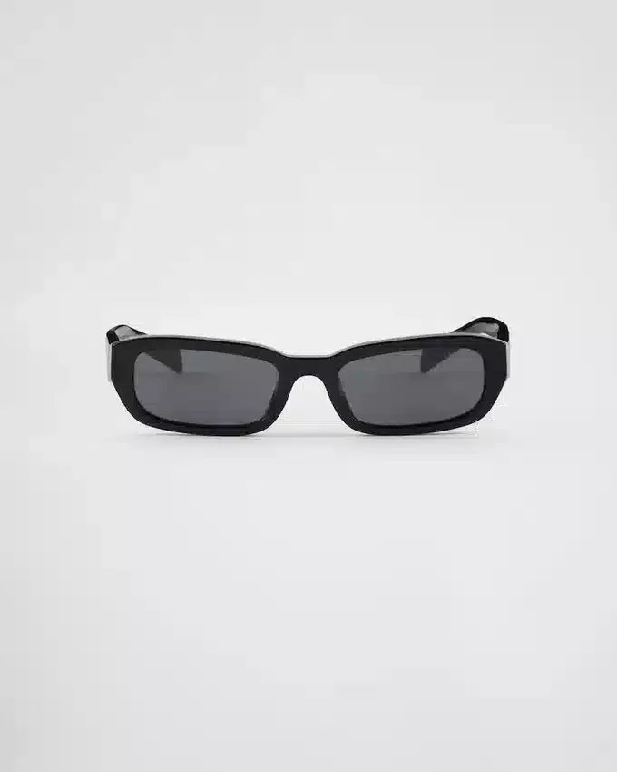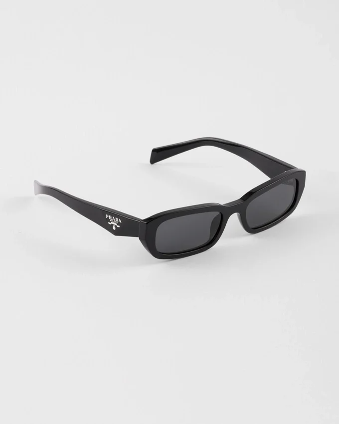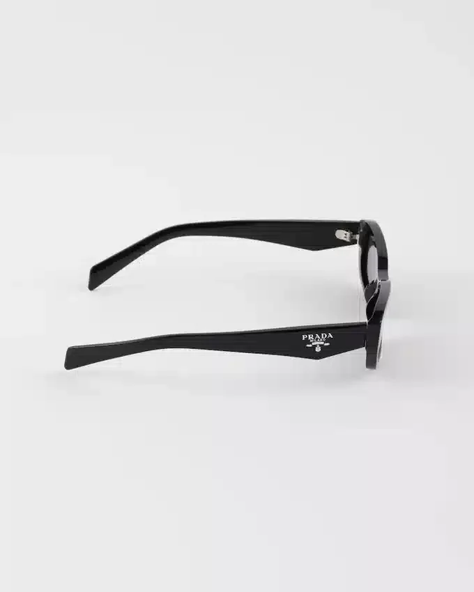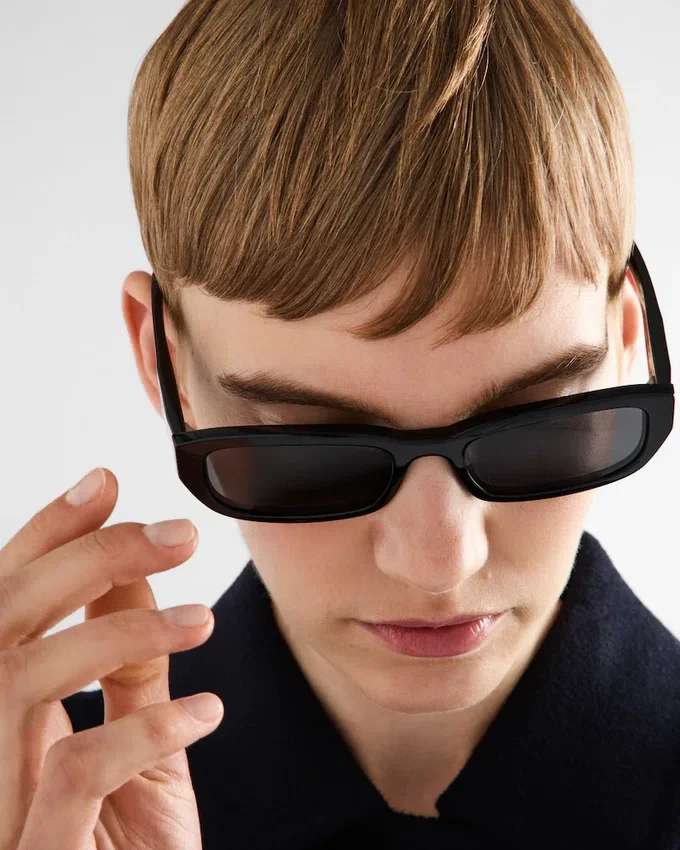 ファセット加工されたリムと幾何学的なラインが特徴のアセテート製サングラス。テンプルには、象徴的なトライアングルロゴを際立たせる洗練された立体的な仕上げが施されています。