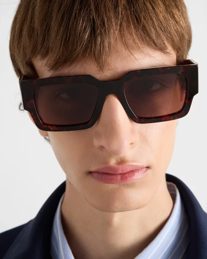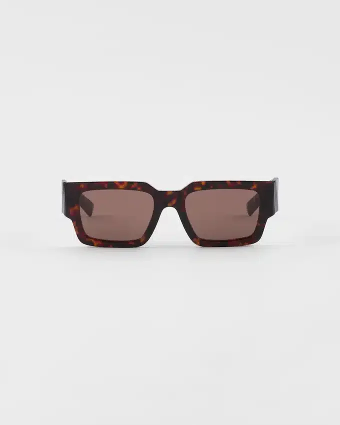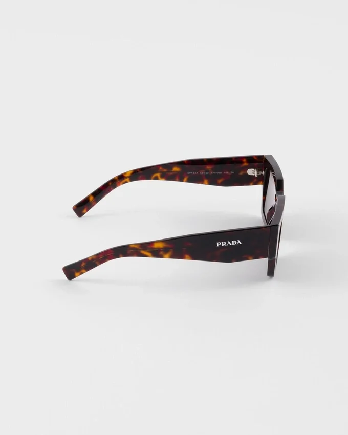 モダンなスクエアデザインのアセテート製サングラス。大胆なリムを備えた大きなフロントは、Pradaのレタリングロゴをあしらった特徴的な立体的な仕上げが施されたファセット加工のテンプルと組み合わされています。いくつかのカラーバリエーションでは、リムのコントラストカラーが際立つアセテートのレイヤーを組み合わせたデザインが特徴です。