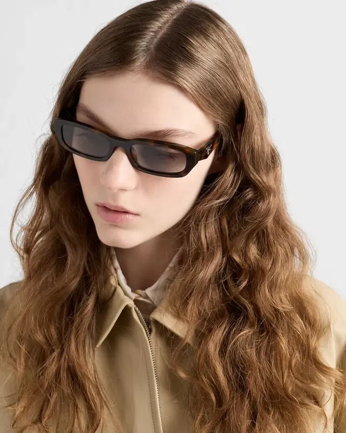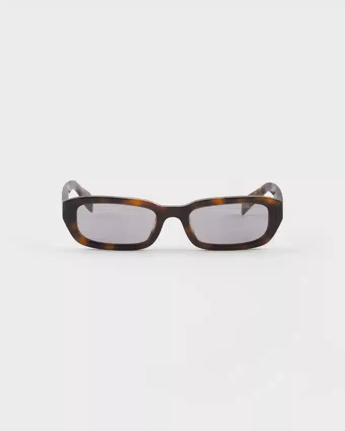 ファセット加工されたリムと幾何学的なラインが特徴のアセテート製サングラス。テンプルには、象徴的なトライアングルロゴを引き立てる洗練された立体的な仕上げが施されています。