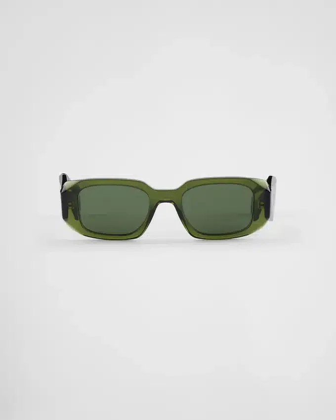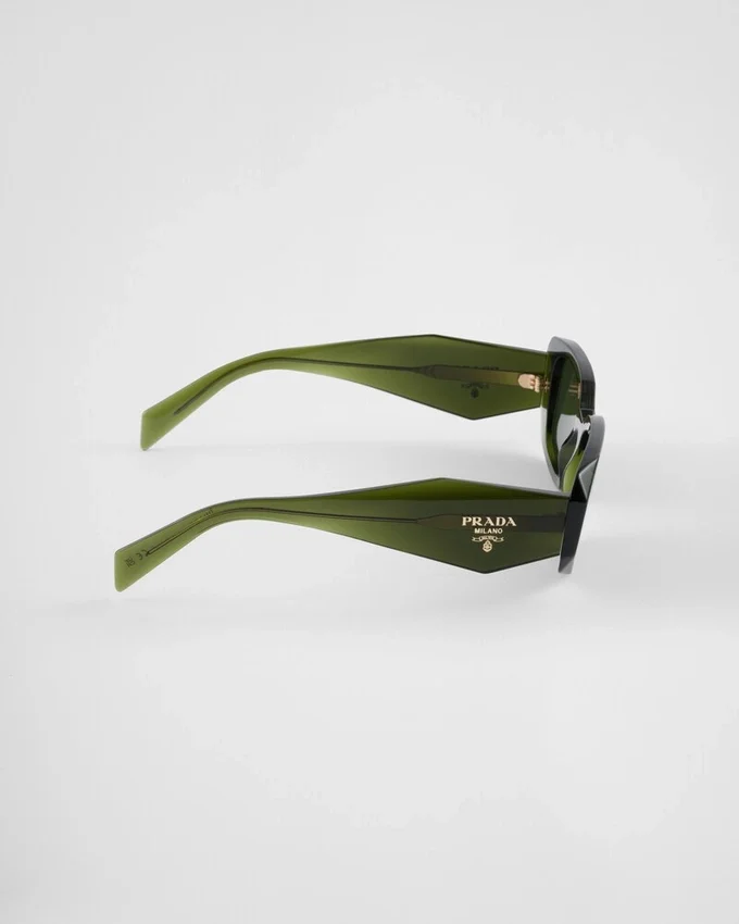 幾何学的なデザインとボリューム感のあるアセテート製サングラス。大胆なフレームは、外側の角を鋭く面取りした前衛的なリムを際立たせています。テンプルの立体的な仕上げには、伝統的なPrada Triangleロゴを象徴的に解釈した装飾が施されています。