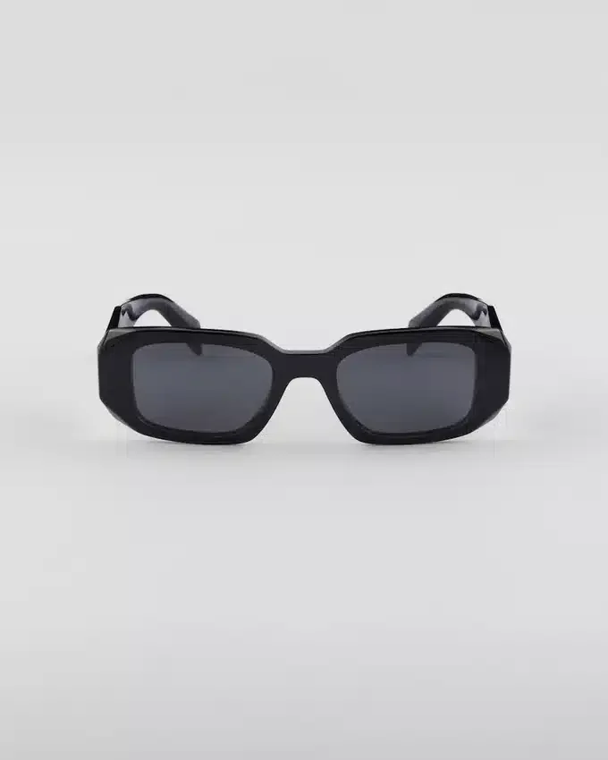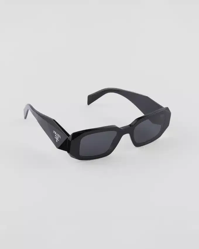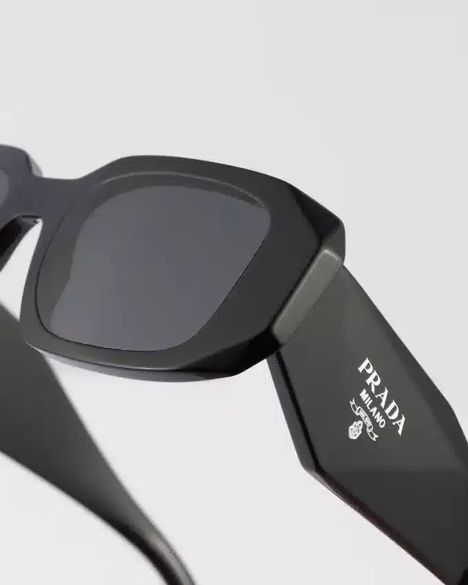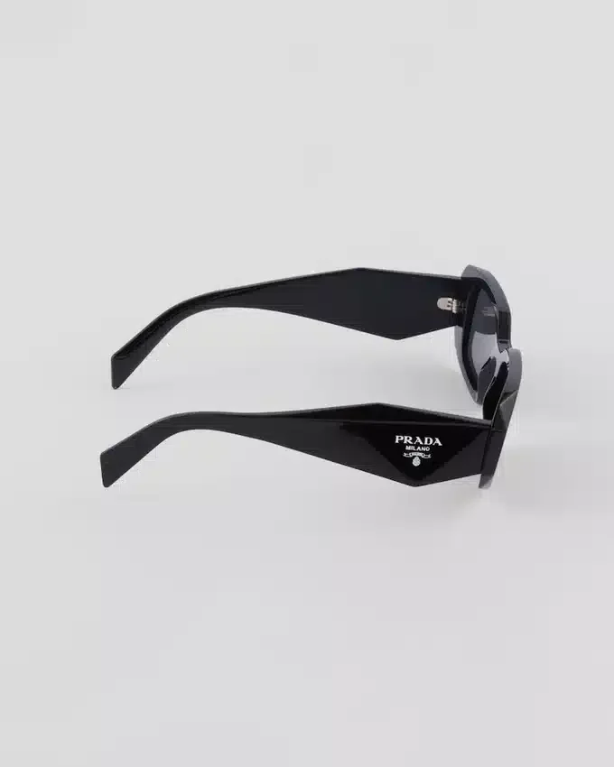 オーバーサイズで幾何学的なデザインのアセテート製サングラス。大胆なフロントフレームは、外側の角を極端な角度でカットすることで定義されたアバンギャルドなシルエットを持っています。テンプルの立体的なデザインには、伝統的なPrada Triangleロゴを象徴的に解釈した装飾が施されています。
