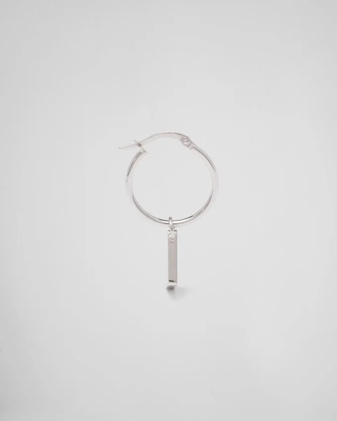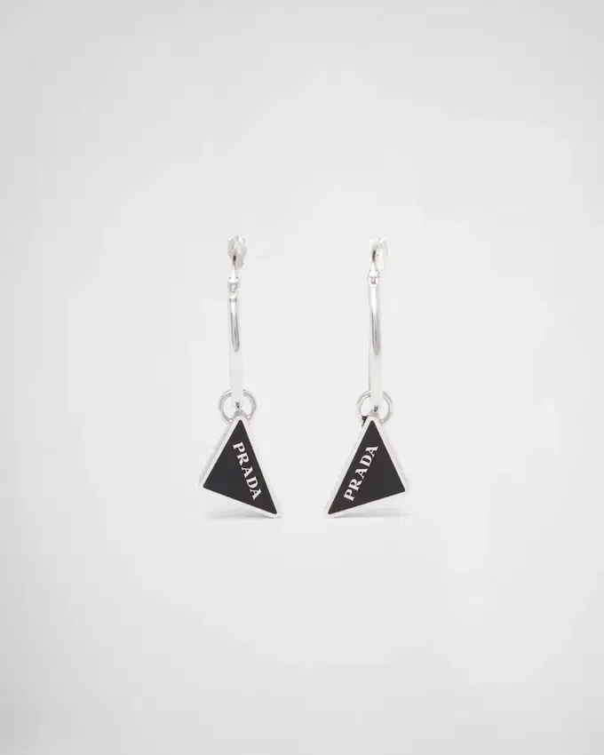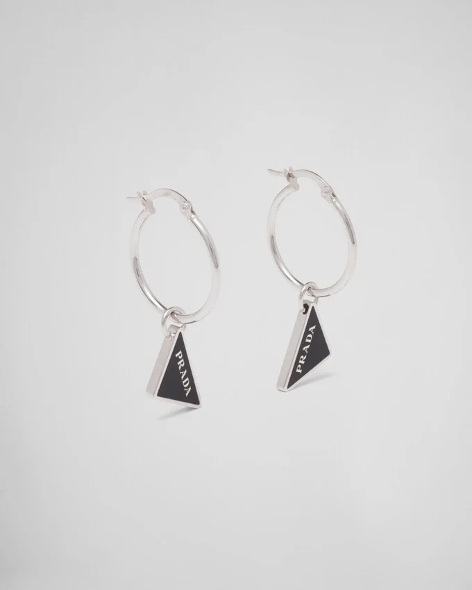 Pradaのエナメル三角ロゴが、繊細なエナメル加工が施されたこのドロップイヤリングの繊細なディテールとして復活しました。アイコニックで洗練されたフォルムの三角ロゴは、パンクの影響を現代的に再解釈した925スターリングシルバー製の新しいジュエリーラインの主役です。