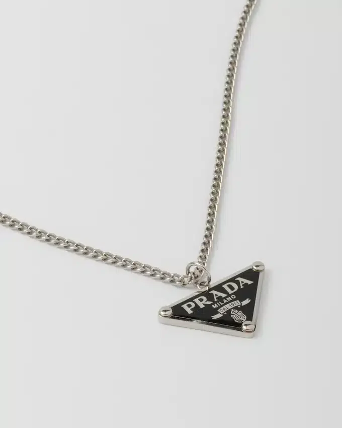 パラジウム仕上げを施したこのショートネックレスのペンダントには、エナメル加工されたPradaの歴史的なシンボルがあしらわれています。アイコニックで洗練されたトライアングルロゴは、パンクの影響を現代的に再解釈した925スターリングシルバー製の新しいジュエリーラインの主役です。