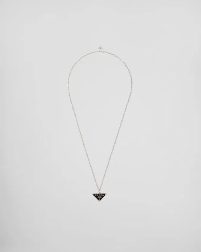 パラジウム仕上げのこのチンネックレスのペンダントには、Pradaの歴史的なシンボルであるエナメルが施されています。アイコニックで洗練されたトライアングルロゴは、パンクの影響を現代的に再解釈した925スターリングシルバー製の新しいジュエリーラインの主役です。