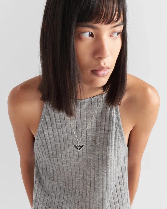 パラジウム仕上げを施したこのチンネックレスのペンダントには、エナメル加工されたPradaの歴史的なシンボルがあしらわれています。象徴的で洗練されたトライアングルロゴは、パンクの影響を現代的に再解釈した925スターリングシルバー製の新しいジュエリーラインの主役です。
