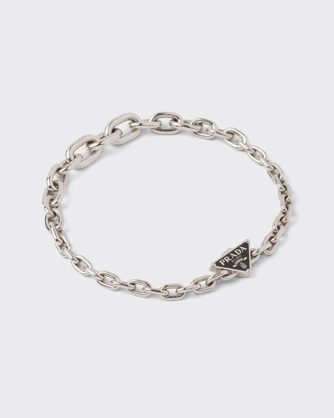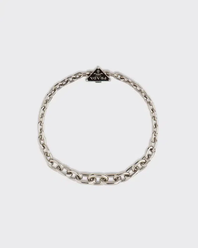 このシルバーネックレスの背面には、太めのチェーンデザインが特徴的な、象徴的なトライアングルが飾られています。アイコニックで洗練されたトライアングルロゴは、パンクの影響を現代的に再解釈した、925 スターリングシルバー製の新しいジュエリーラインの主役です。