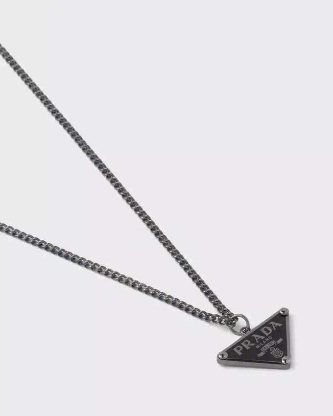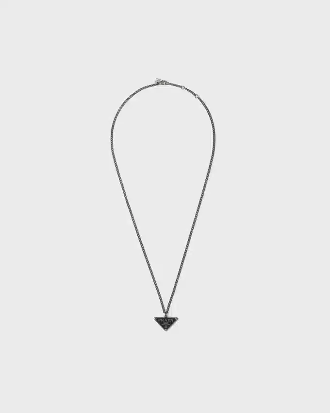 パラジウム仕上げのこのチェーンネックレスのペンダントには、エナメル加工されたPradaの歴史的なシンボルがあしらわれています。象徴的でエッセンシャルなフォルムを持つトライアングルロゴは、パンクの影響を現代的に再解釈した925スターリングシルバー製の新しいジュエリーラインの主役です。