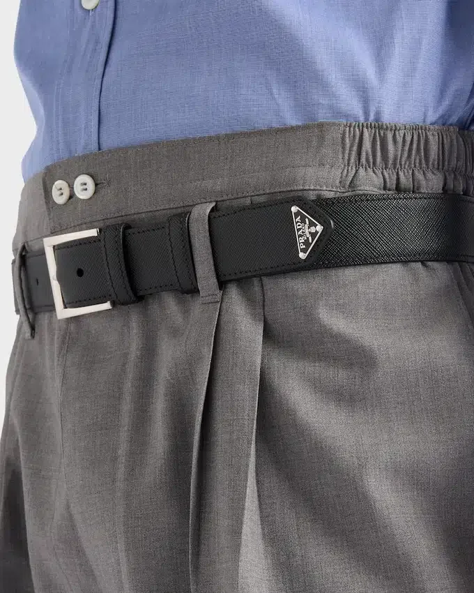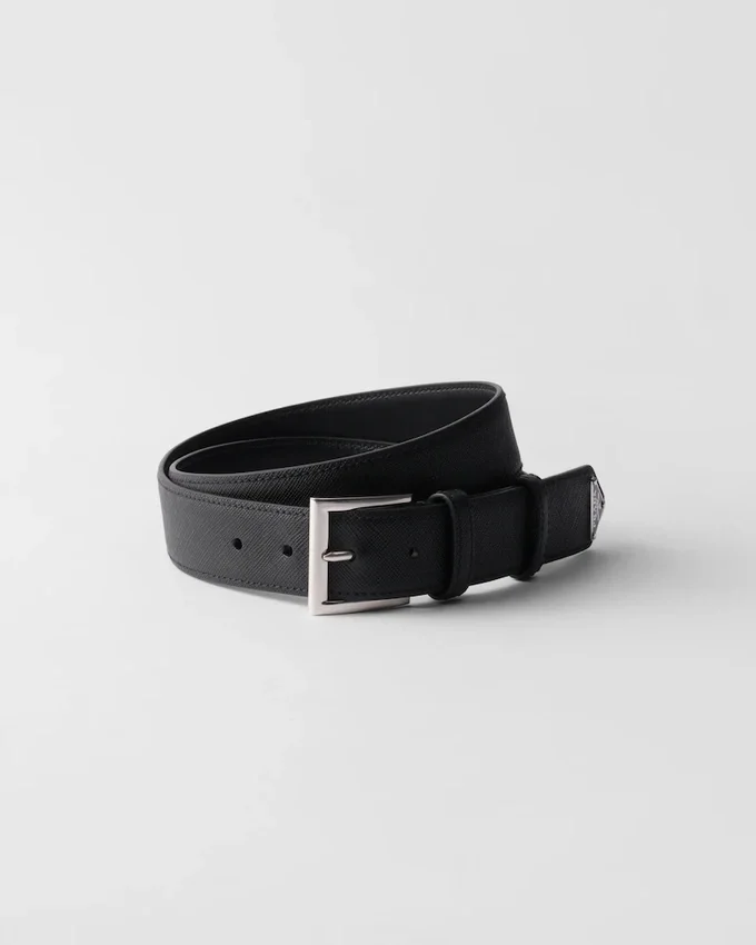 象徴的なエナメル加工の金属製トライアングルロゴをあしらった、洗練されたデザインが特徴のSaffianoレザーベルトです。