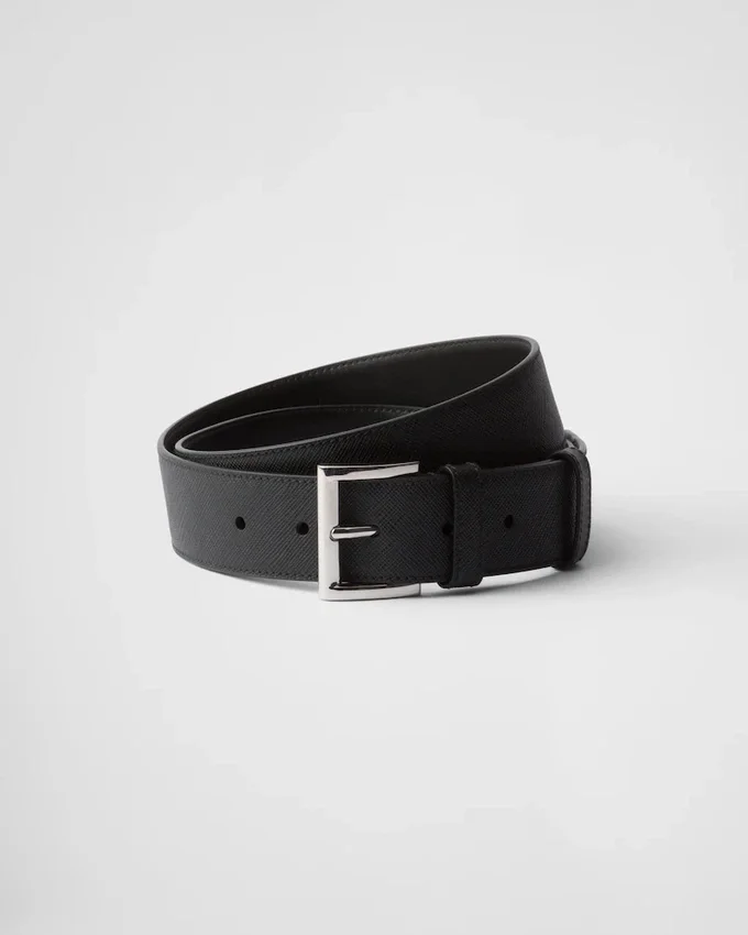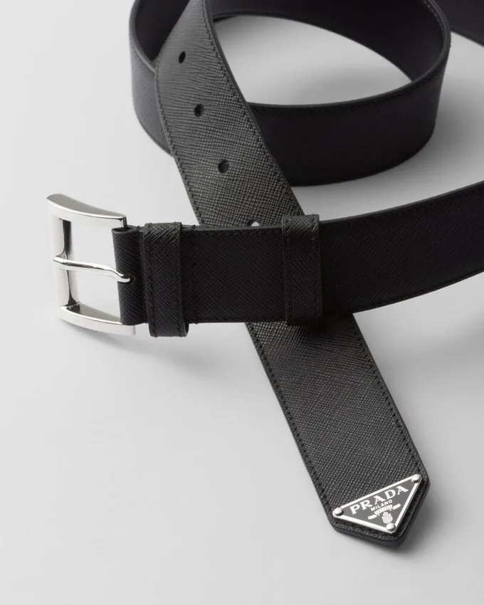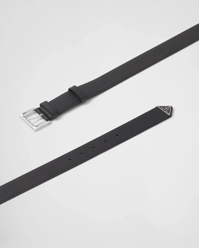 洗練された洗練されたデザインが特徴のこのベルトは、メタルバックルで仕上げられ、先端に際立つトライアングルロゴがあしらわれています。デザインには、ワックス加工とクロスハッチのテクスチャーが特徴的な、ブランドの象徴的なSaffianoレザーが使用されています。