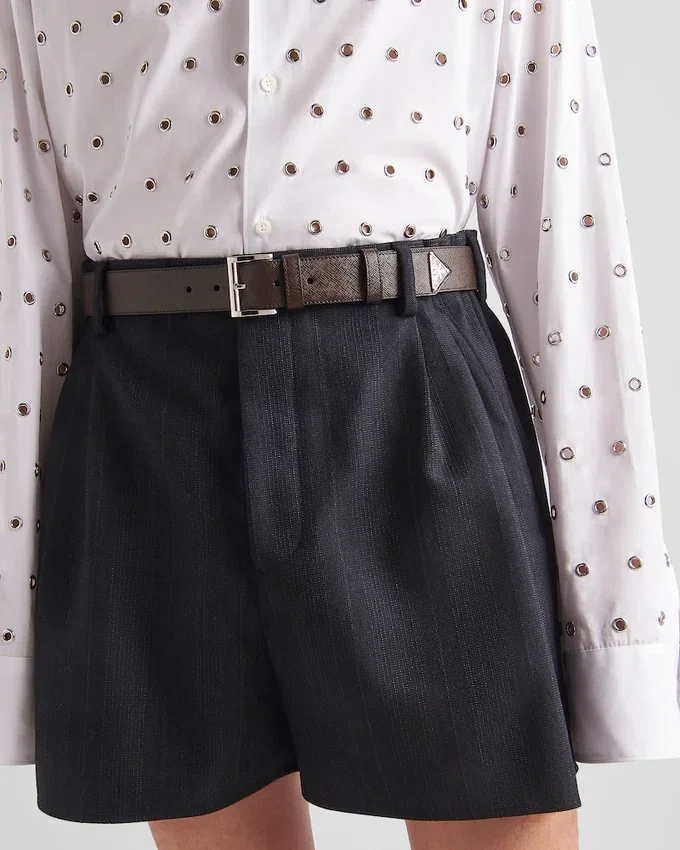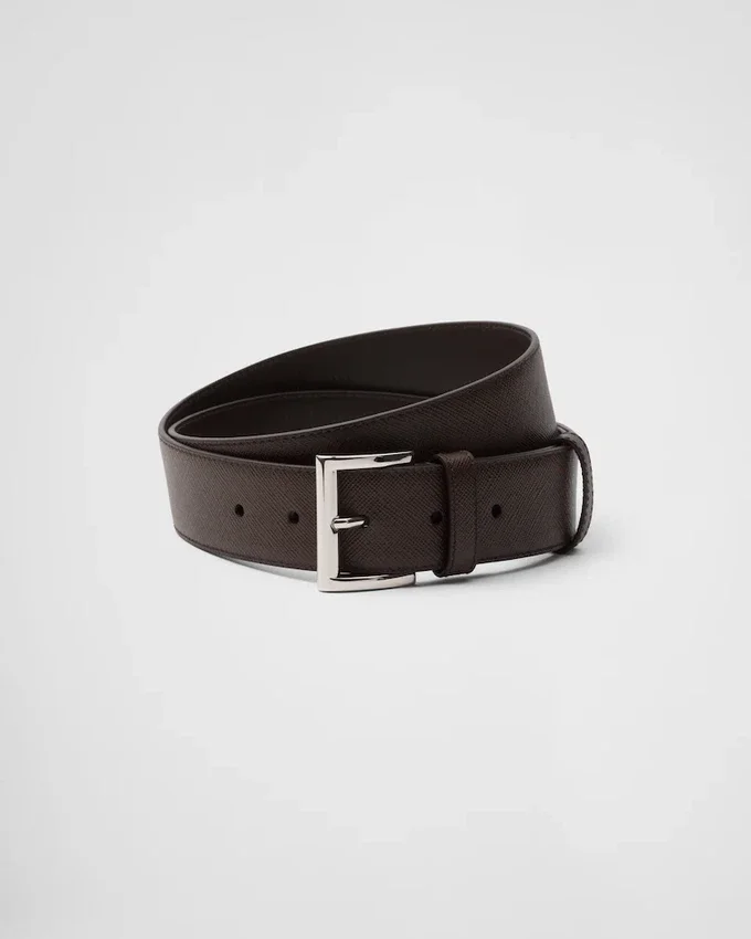 洗練された洗練されたデザインが特徴のこのベルトは、メタルバックルで仕上げられ、先端に際立つトライアングルロゴがあしらわれています。デザインには、ワックス加工とクロスハッチのテクスチャーが特徴的な、ブランドの象徴的なSaffianoレザーが使用されています。