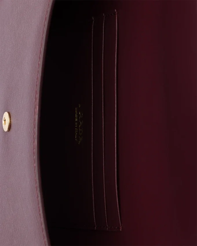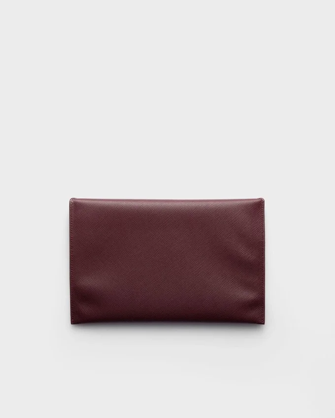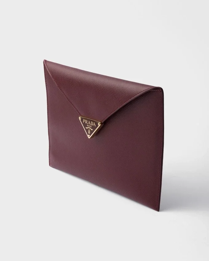 Saffianoレザーを使用した、洗練された機能的なエンベロープクラッチは、洗練されたデザインが特徴です。カードスロット付きのこのアクセサリーには、エナメル加工されたメタル製の三角ロゴがあしらわれています。