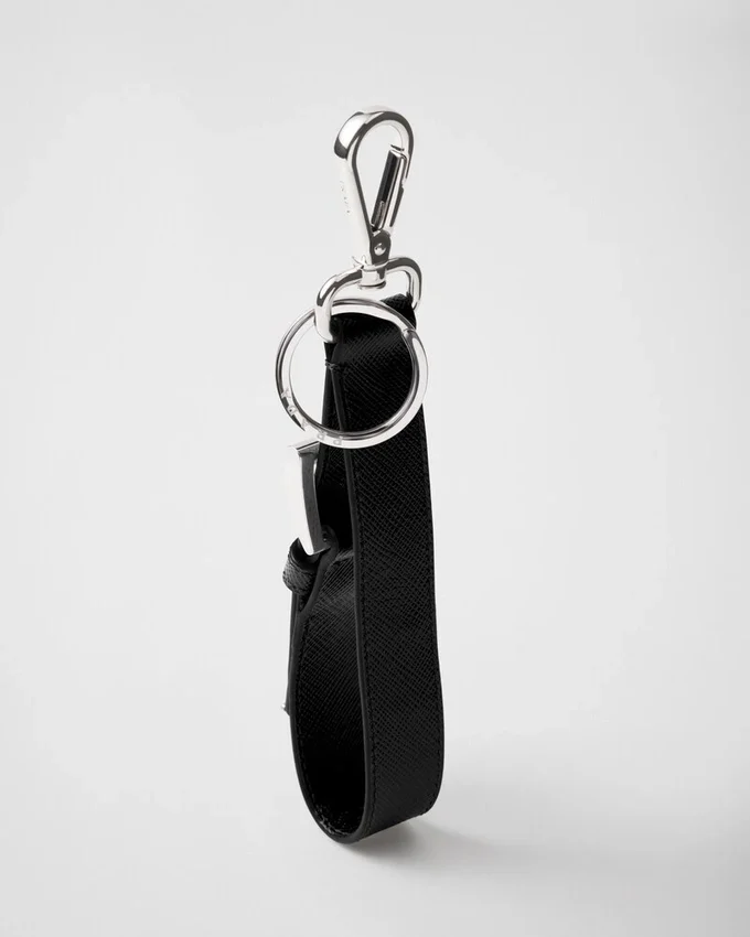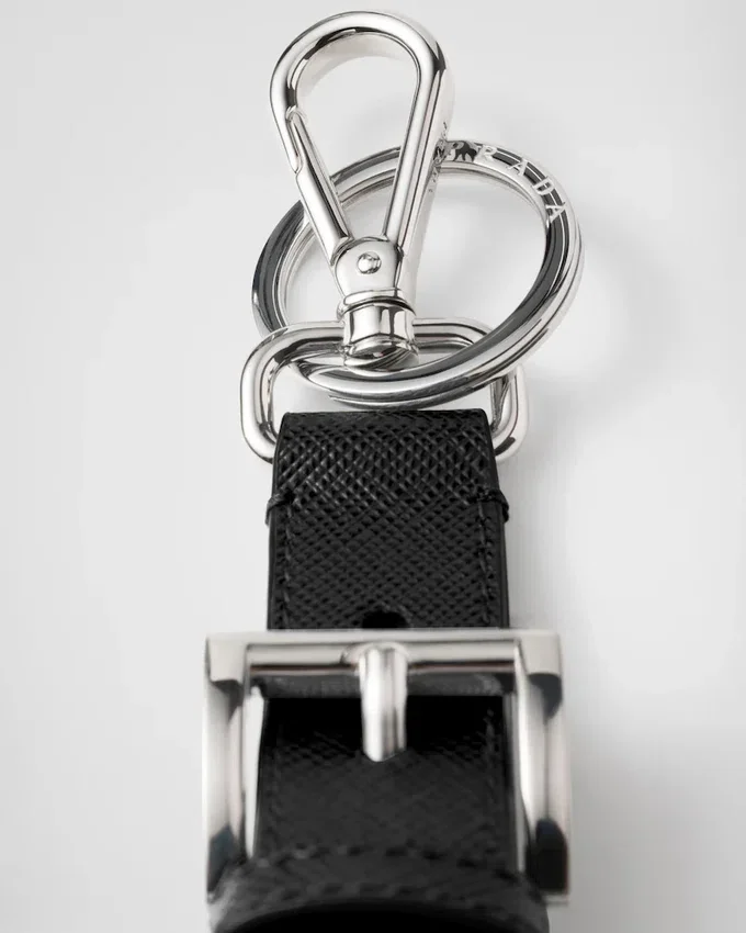 象徴的な幾何学的な三角形のロゴが、洗練されたデザインでこの上品なレザーキーホルダーを彩ります。
