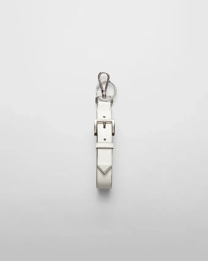 象徴的な幾何学模様であるトライアングルロゴが、洗練されたレザーキーホルダーを彩り、滑らかで洗練されたデザインに仕上げています。