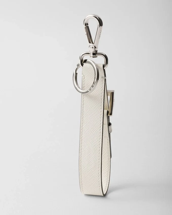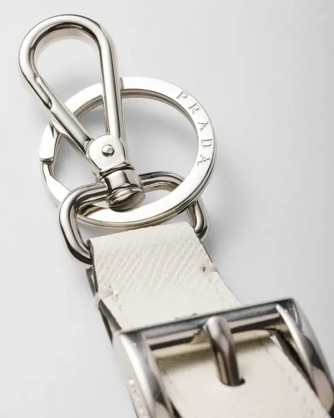 三角ロゴの象徴的な幾何学模様が、洗練されたデザインを誇るこの上品なレザーキーホルダーを彩ります。