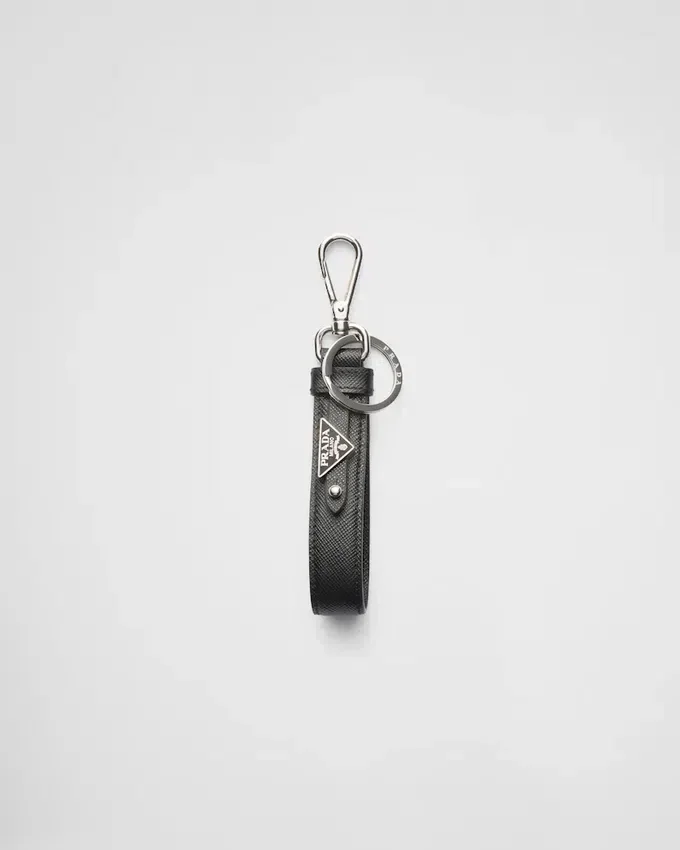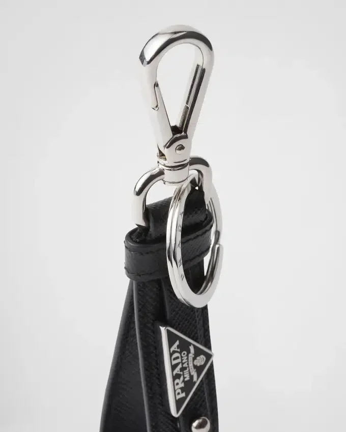 このSaffianoレザーのキーホルダーは、取り外し可能なエナメル加工の金属製トライアングルロゴがあしらわれ、デザインに象徴的なアクセントを加えています。Prada店舗にて、交換可能な文字やチャームでカスタマイズが可能で、ユニークでオリジナルなアレンジをお楽しみいただけます。