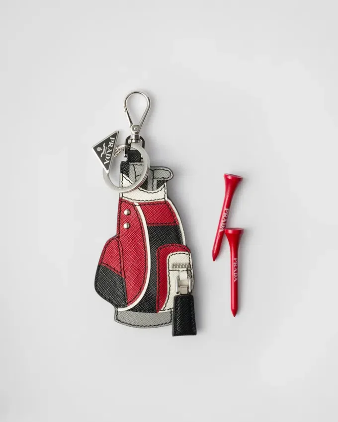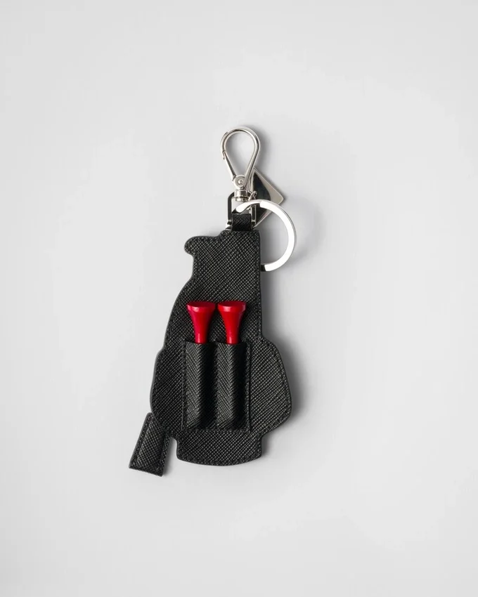 Saffianoレザー製のこのスポーティーなバッグチャームは、遊び心のある多機能なデザインで、ゴルフティーを収納するのに最適です。