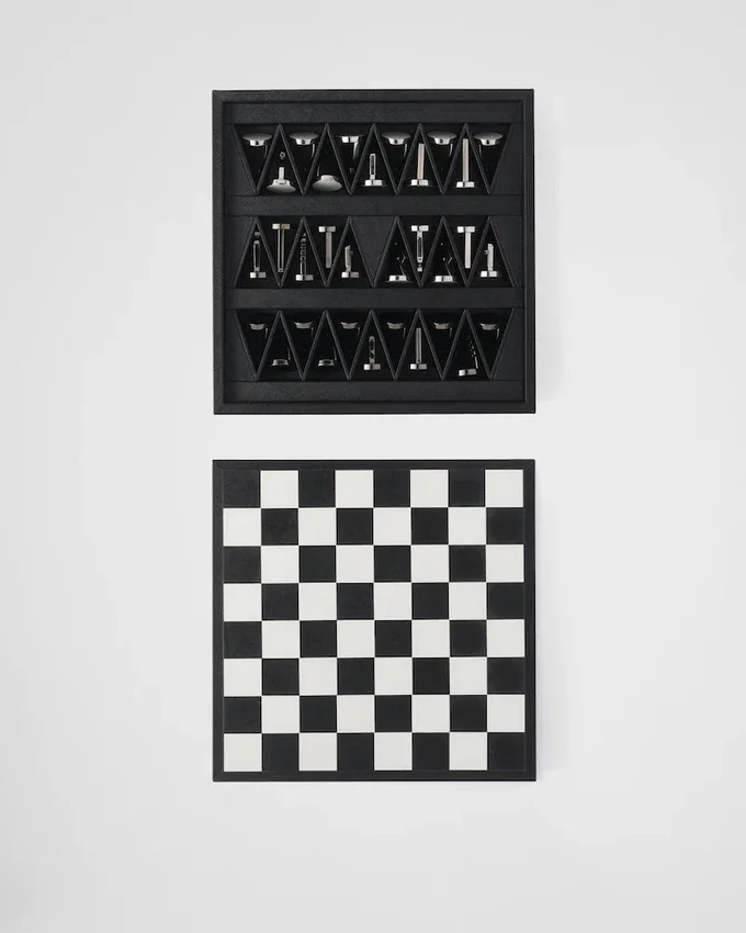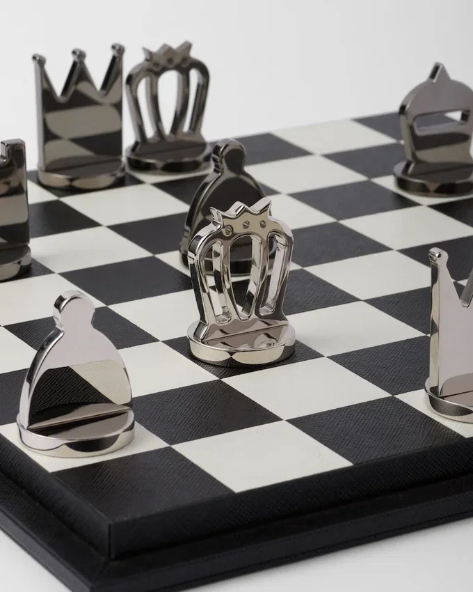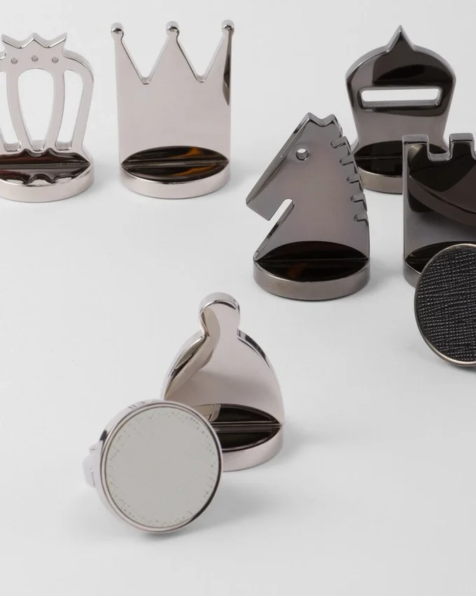 エレガントなSaffianoレザーのボックスに収められた、金属製駒のエレガントなチェスセット。