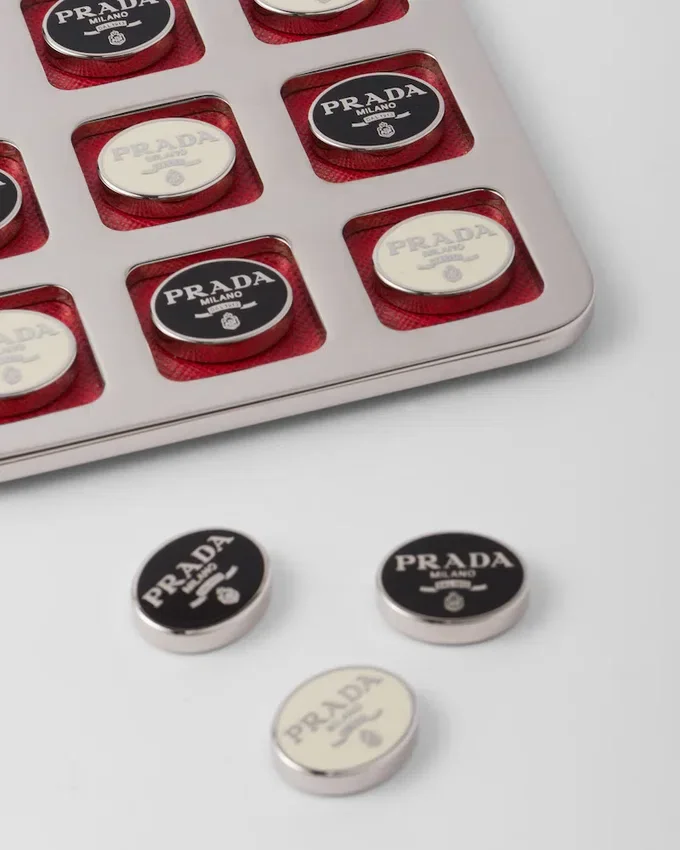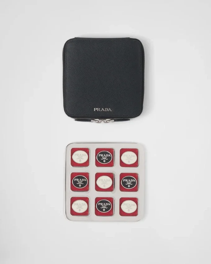 Pradaロゴをあしらった駒が特徴のエレガントな三目並べセット。ジッパー付きの洗練されたSaffianoレザーケースに収納されています。