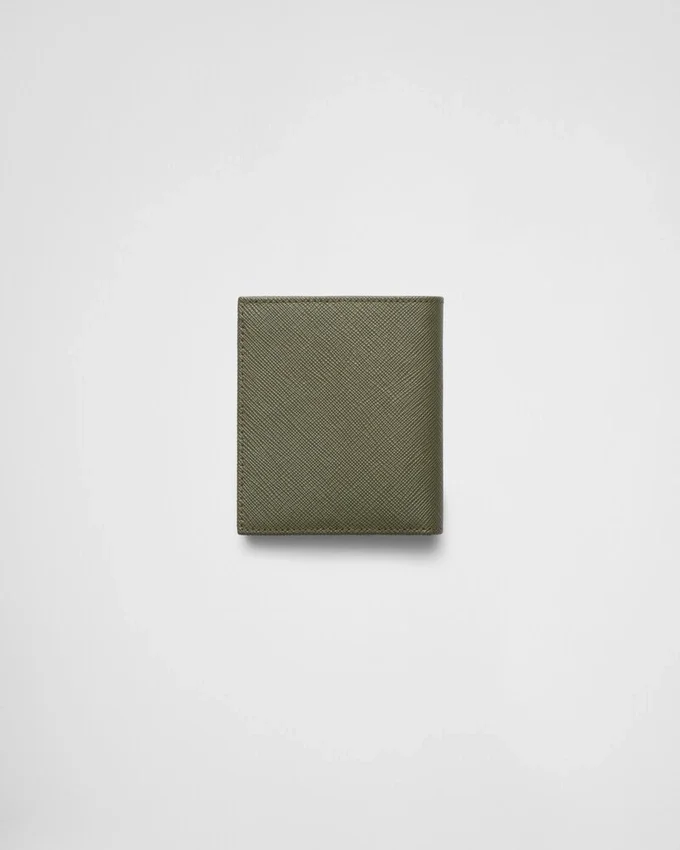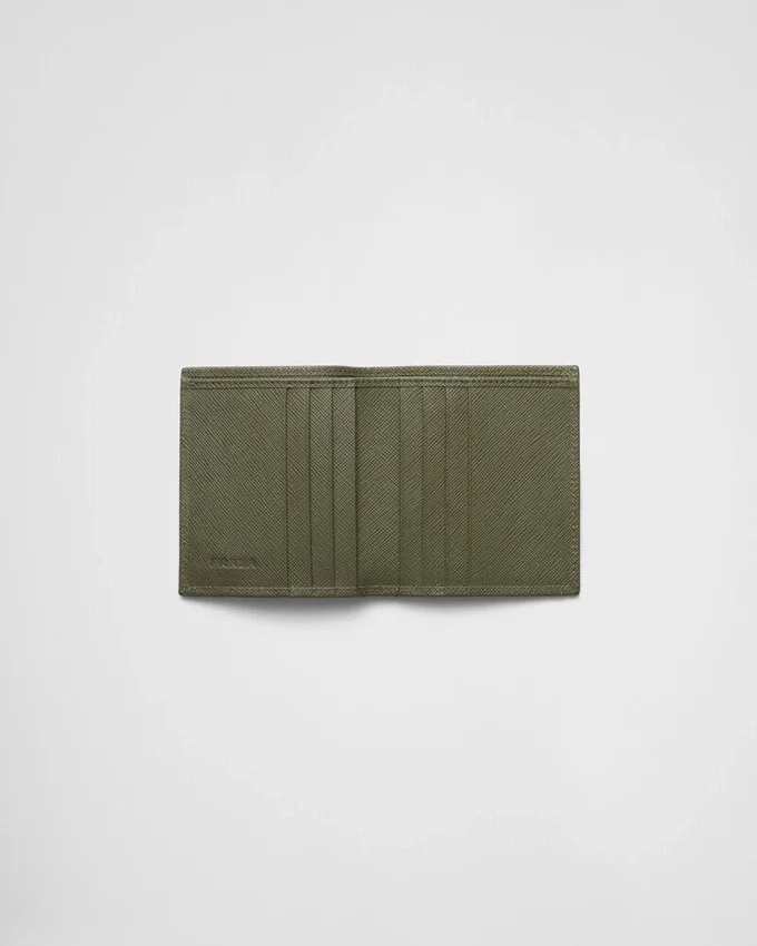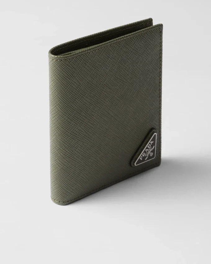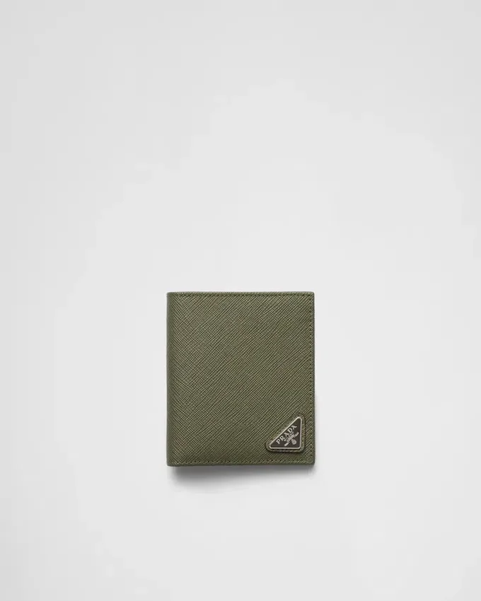 このエレガントなSaffianoレザーの財布は、エナメル加工の三角ロゴがあしらわれています。内部には2つのポケット、紙幣用コンパートメント1つ、カードスロット8つが備わっています。