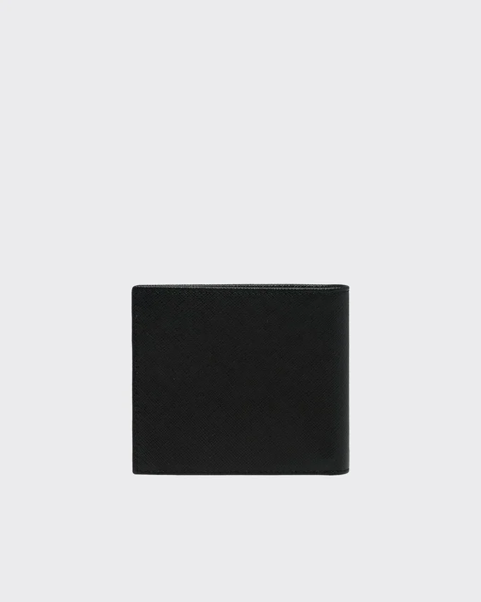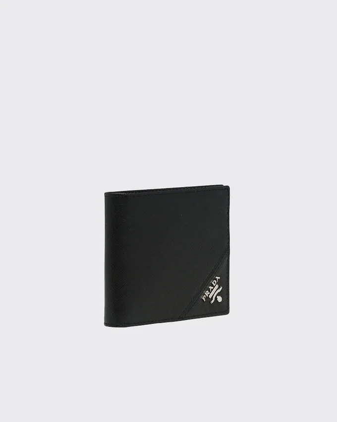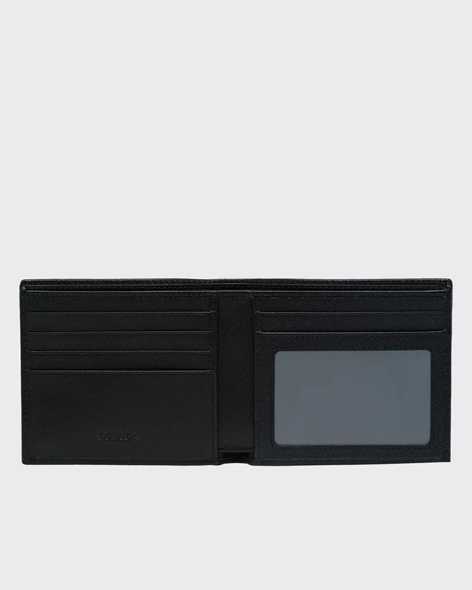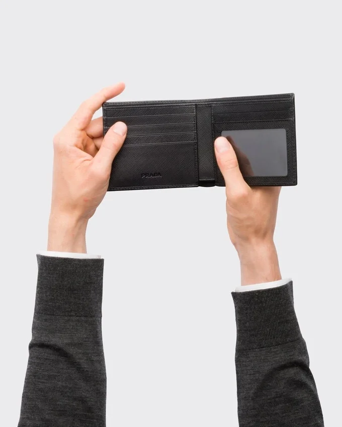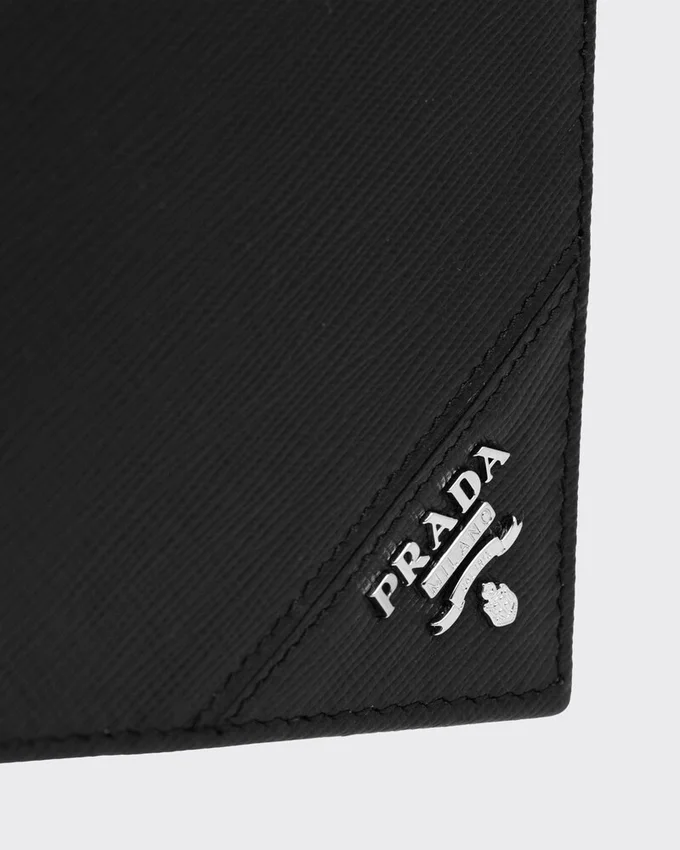 この財布は、Saffianoレザーのクロスハッチ模様と、内側に付いたネームタグ用ポケットが特徴です。メタル製のPradaロゴがあしらわれ、開くと、すべてファブリック裏地付きの様々なコンパートメント、ポケット、スロットが現れます。