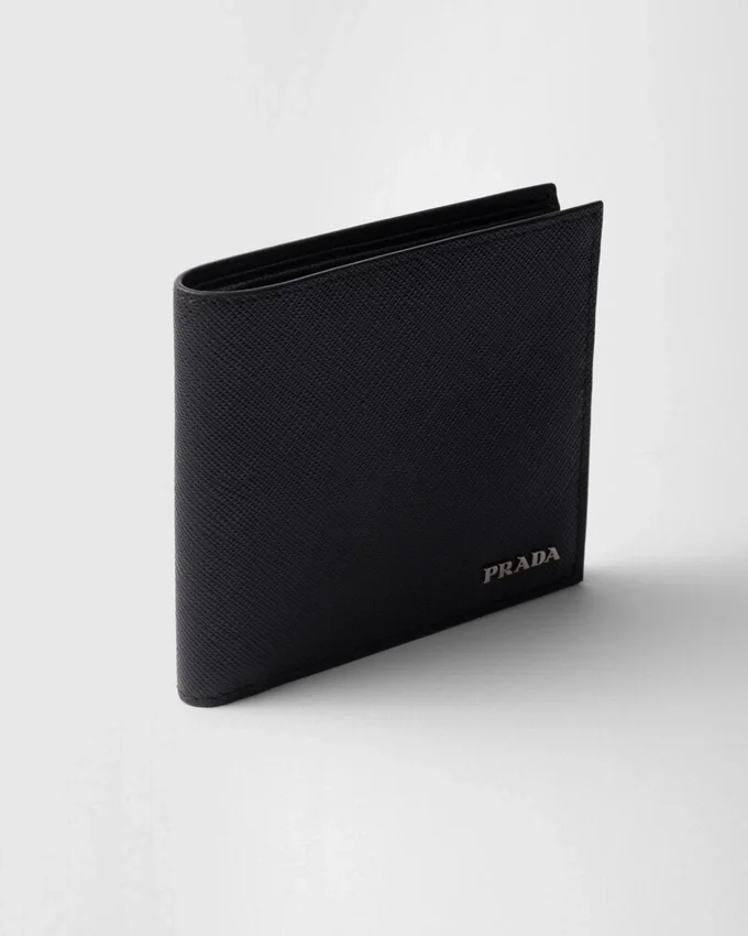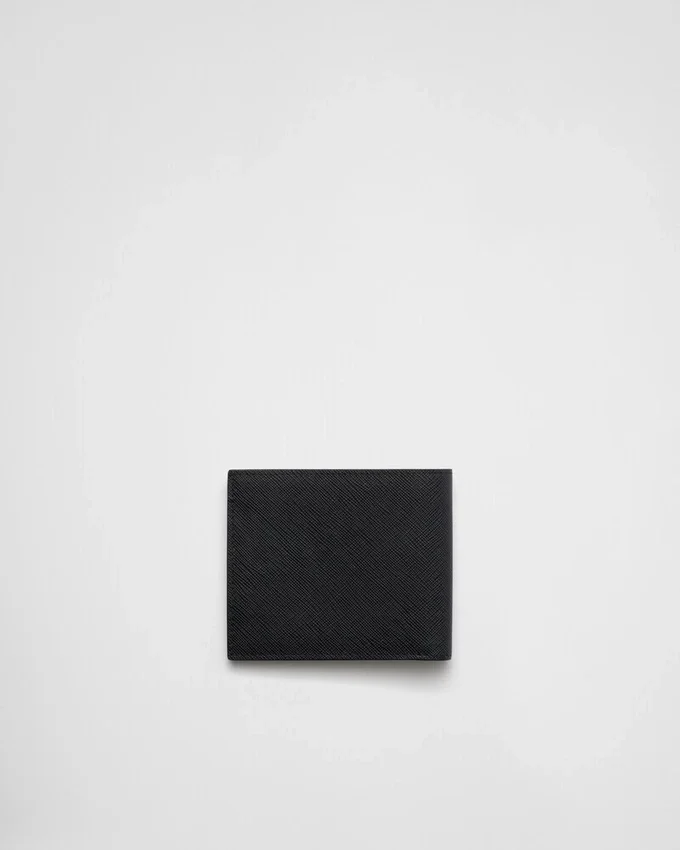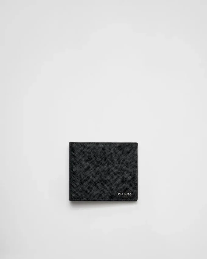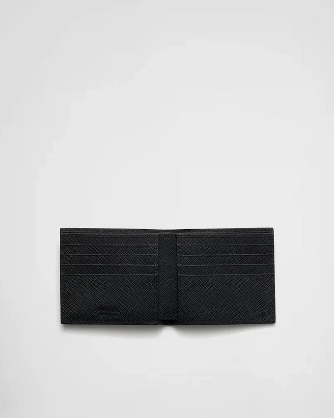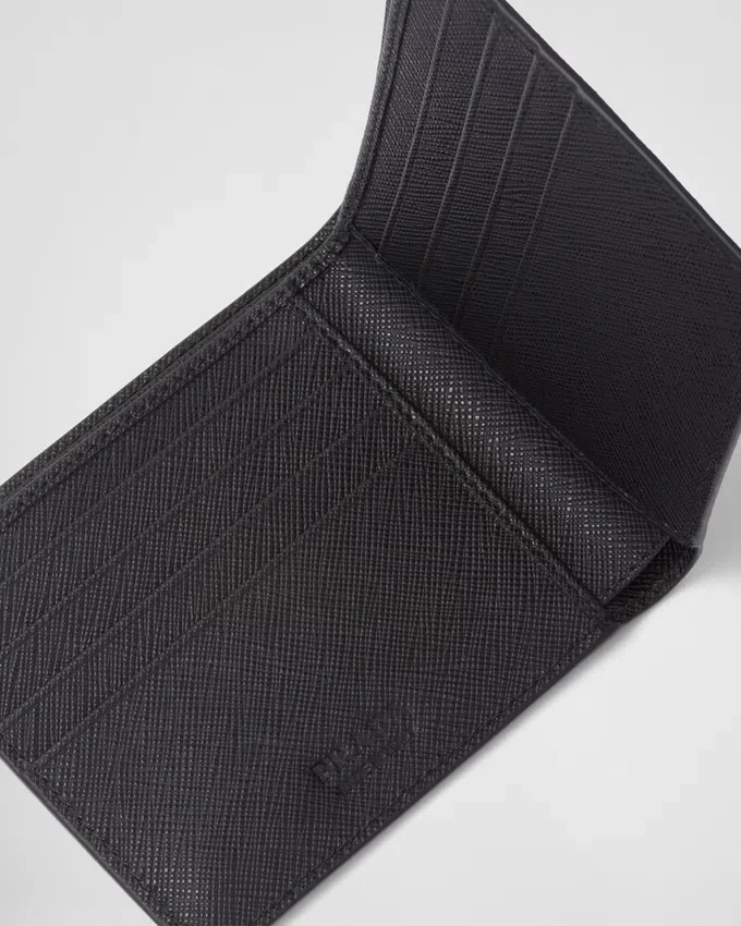 このウォレットは、Saffianoレザーのクロスハッチデザインと、前面に配されたPradaのメタルレタリングロゴが特徴です。開くと8つのクレジットカードスロット、複数のコンパートメントやポケットがあり、全体がファブリックで裏地処理されています。