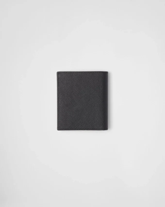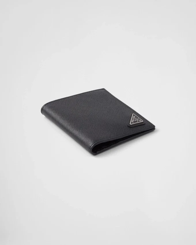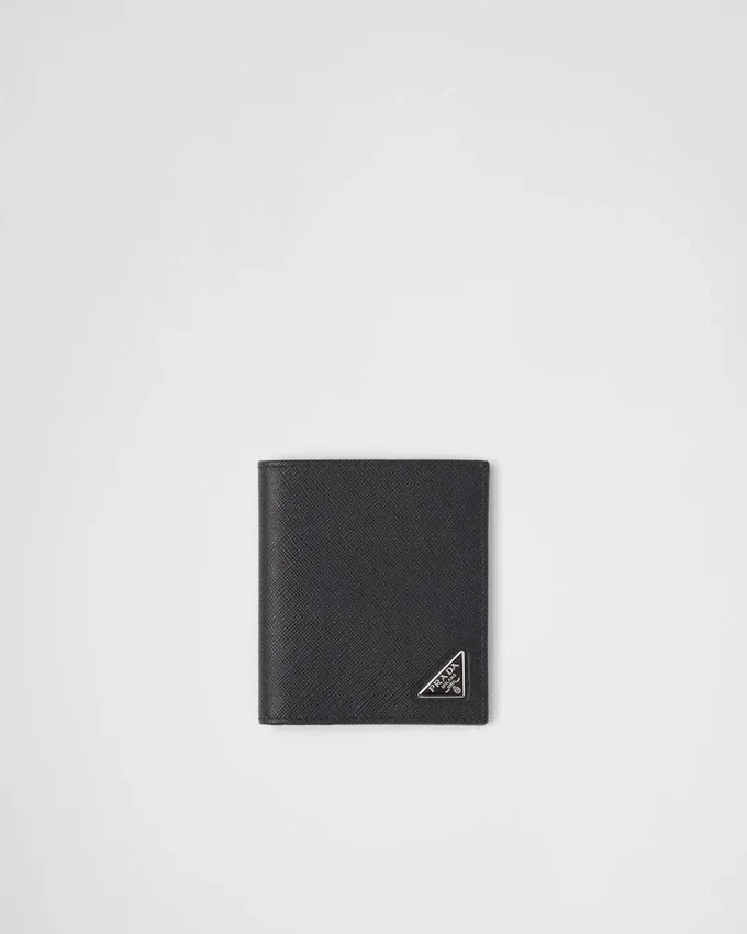 このエレガントなSaffianoレザーの財布は、エナメル加工の三角ロゴがあしらわれています。内部には2つのポケット、紙幣用コンパートメント1つ、カードスロット8つを備えています。