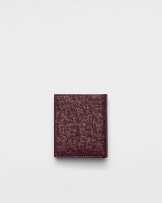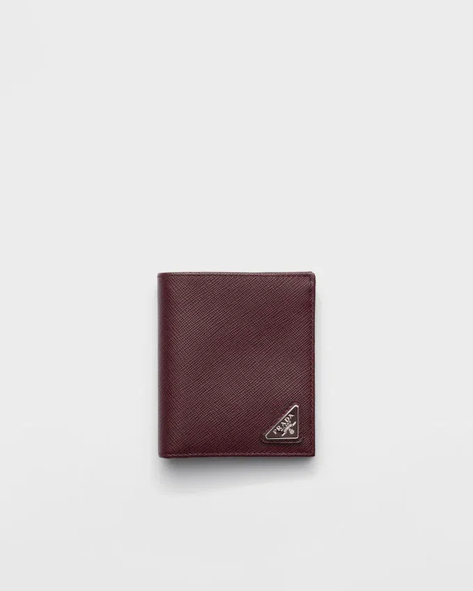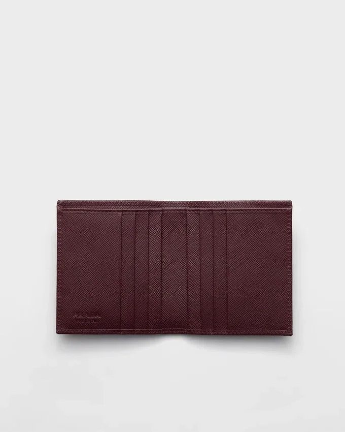 このエレガントなSaffianoレザーの財布は、エナメル製の三角ロゴがあしらわれています。内部には2つのポケット、紙幣用コンパートメント1つ、カードスロット8つが備わっています。