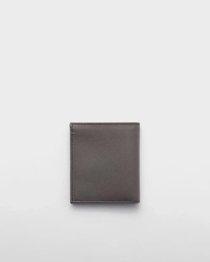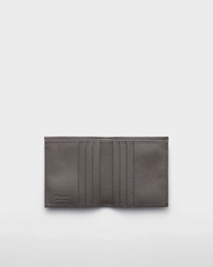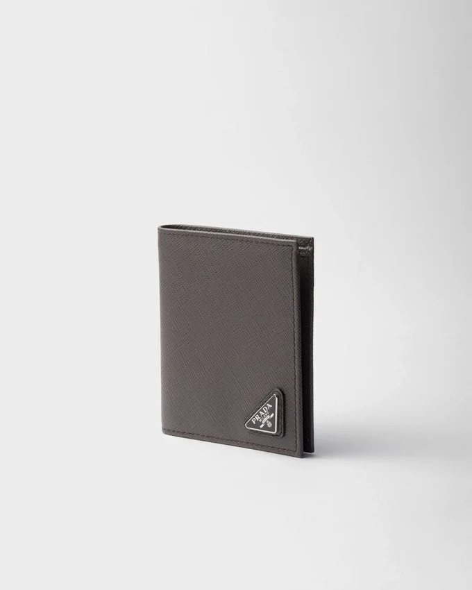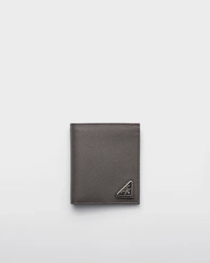 このエレガントなSaffianoレザーの財布は、エナメル加工の三角ロゴがあしらわれています。内部には2つのポケット、紙幣用コンパートメント1つ、カードスロット8つが備わっています。