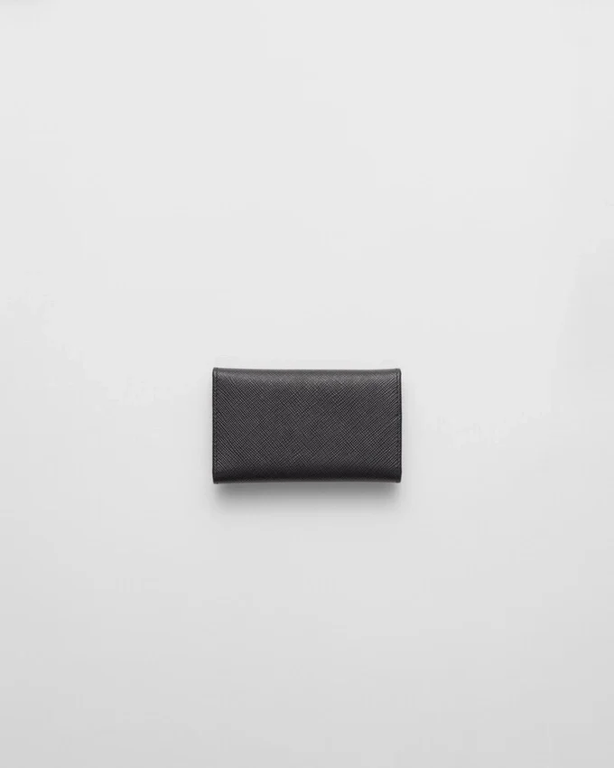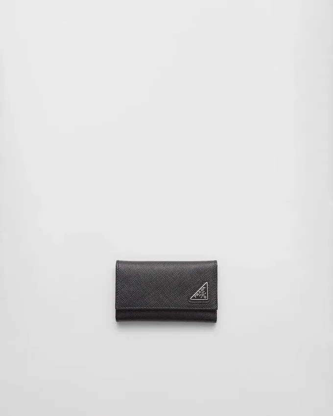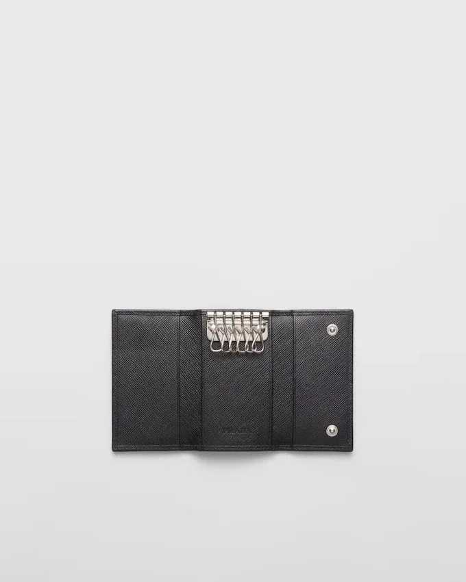 底部の角に三角形のPRADAロゴをあしらったSaffianoレザー製キーホルダー。内部には鍵用フックが6つと、布地で裏打ちされたポケットが2つ付いています。
