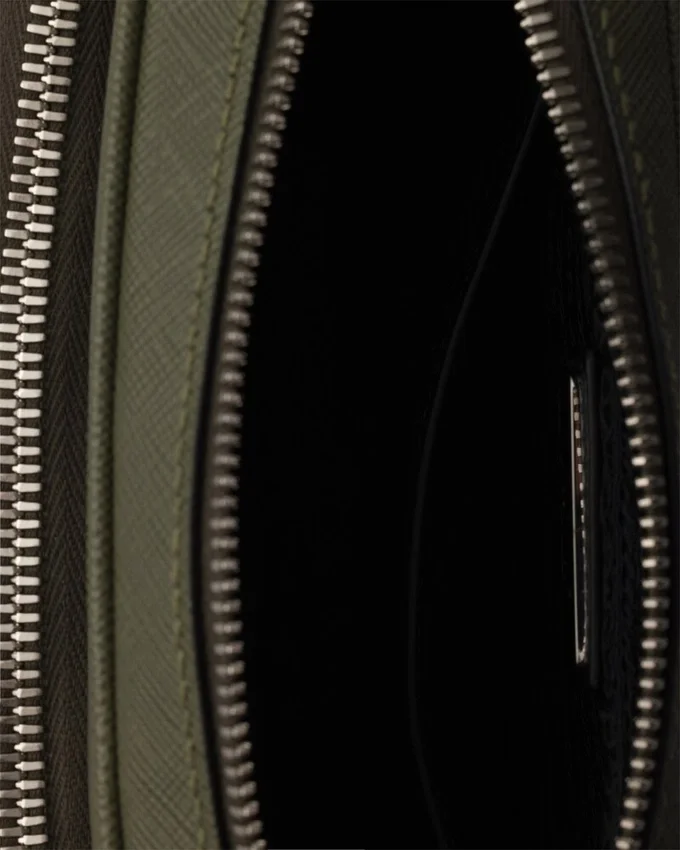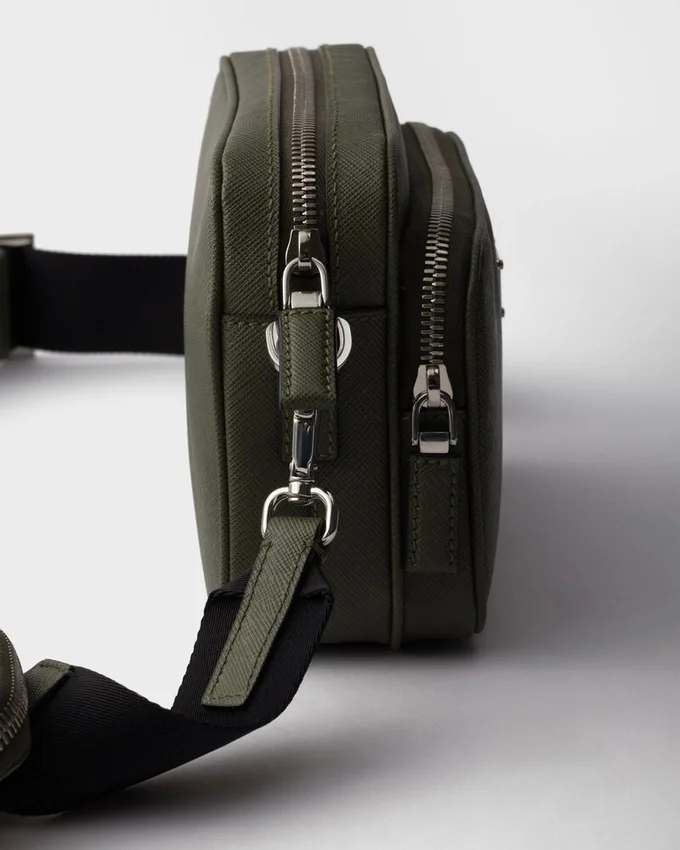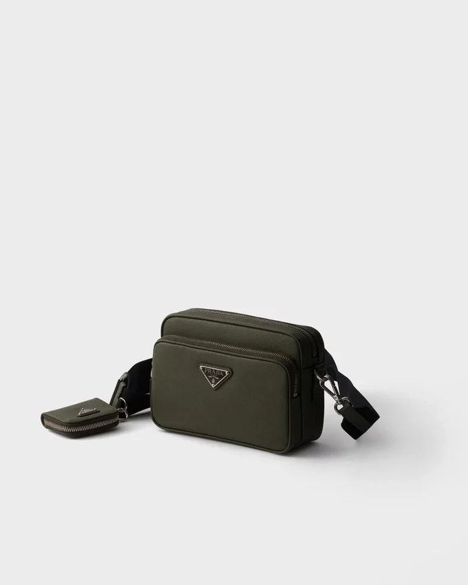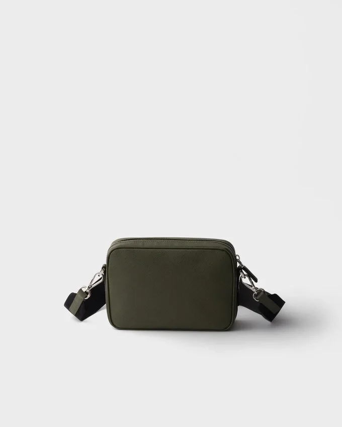 このショルダーバッグはSaffianoレザー製です。Pradaの象徴的な素材であるSaffianoレザーは、ラグジュアリーの代名詞であり、伝統的なイタリアのレザー職人技を体現しています。前面には、象徴的なポーチとエナメル加工されたメタル製の三角ロゴがあしらわれています。