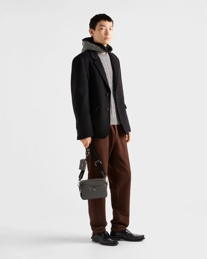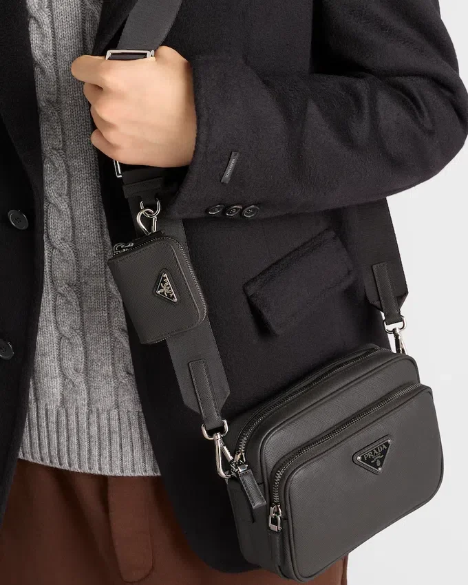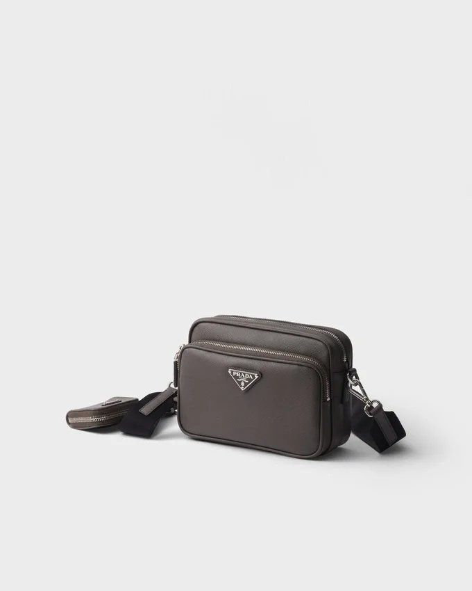 このショルダーバッグはSaffianoレザー製です。Pradaの象徴的な素材であるSaffianoレザーは、ラグジュアリーの代名詞であり、伝統的なイタリアのレザー職人技を体現しています。前面には、象徴的なポーチとエナメル加工されたメタル製のトライアングルロゴがあしらわれています。