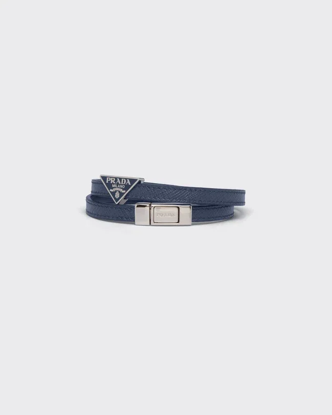 レザー製のこのダブルブレスレットには、Pradaのロゴが2つあしらわれています。