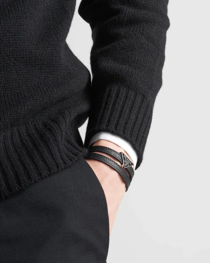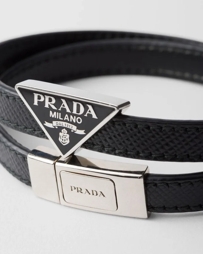 このレザー製のダブルブレスレットには、Pradaのロゴが2つあしらわれています。