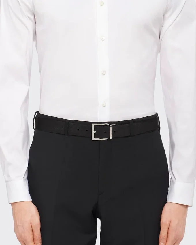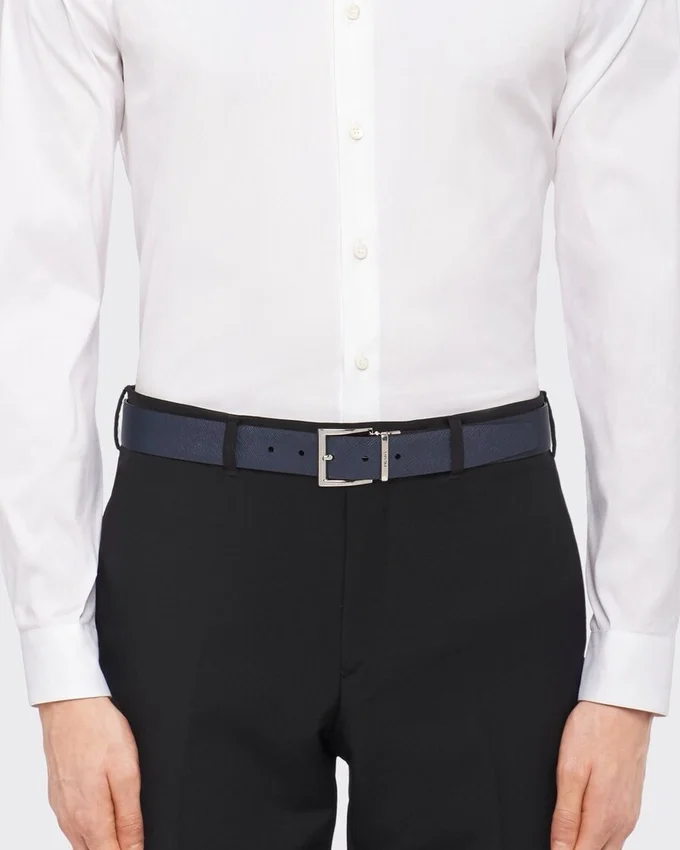 裏面が異なる色合いになっているこの3.3cm幅のベルトは、裏返して様々なコーディネートに合わせることができます。磨き上げられたスチール製バックルには、Pradaのロゴが刻印されています。
