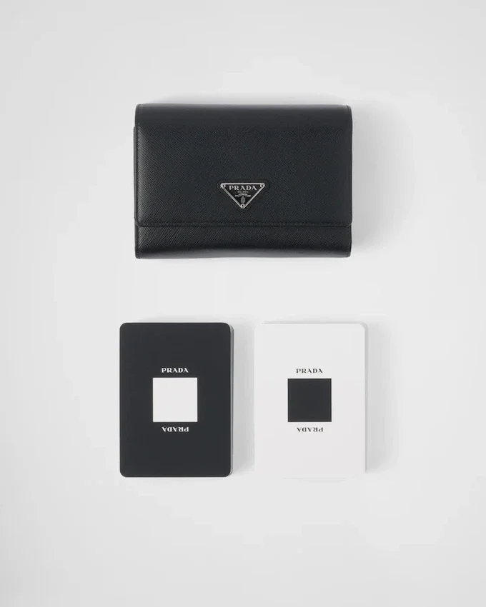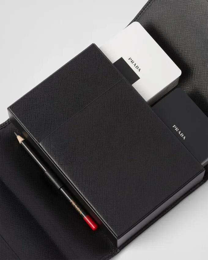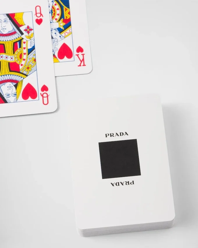 2組のトランプがセットになったこのキットには、Pradaの象徴的な素材であるSaffiano製の豪華なケースが付属しています。最高品質のカーフレザーを使用し、クロスハッチのテクスチャーとワックス仕上げが特徴です。エナメル加工された金属製の三角ロゴが、このアクセサリーを引き立てています。