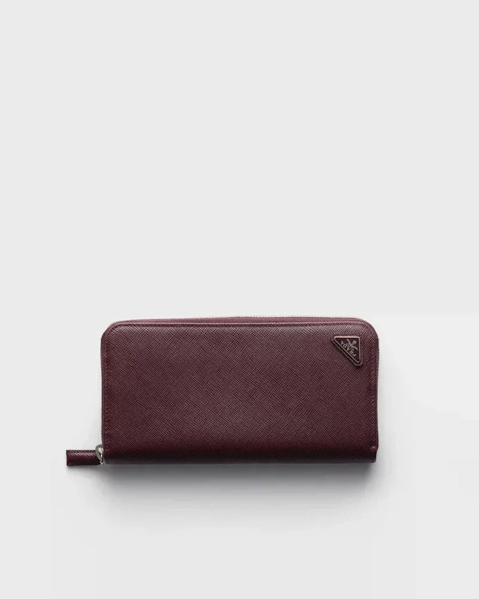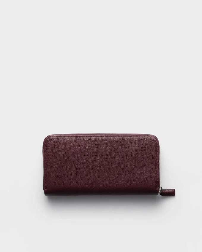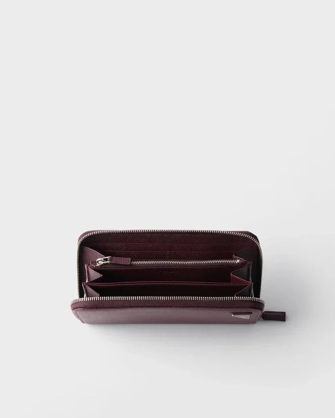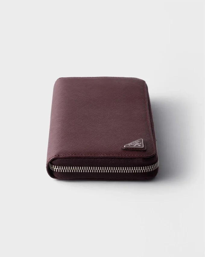 このエレガントなSaffianoレザーのジッパーウォレットは、エナメル加工された金属製の三角ロゴが施されています。内部には3つのコンパートメント、ジッパーポケット、12枚のカードスロットが備わっています。