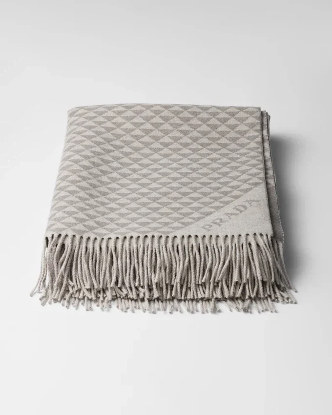 Prada Triangleが、幾何学的なモダニズムのパターンへと変貌し、カシミアとウールで作られたこの洗練されたスローを彩っています。