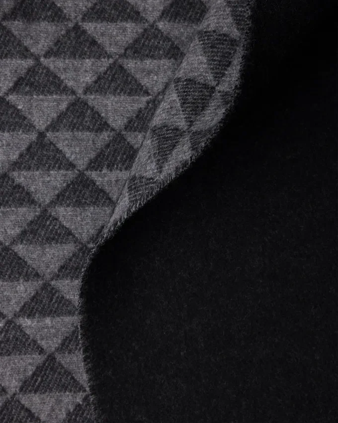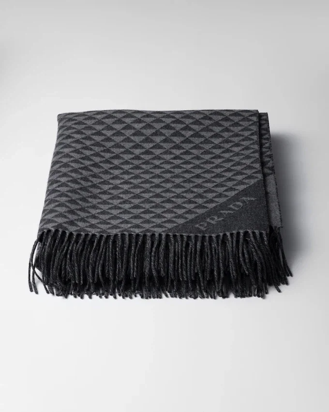 Prada Triangleが、幾何学的なモダニズムのパターンへと変貌し、カシミアとウールで作られたこの洗練されたスローを彩っています。