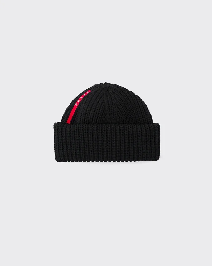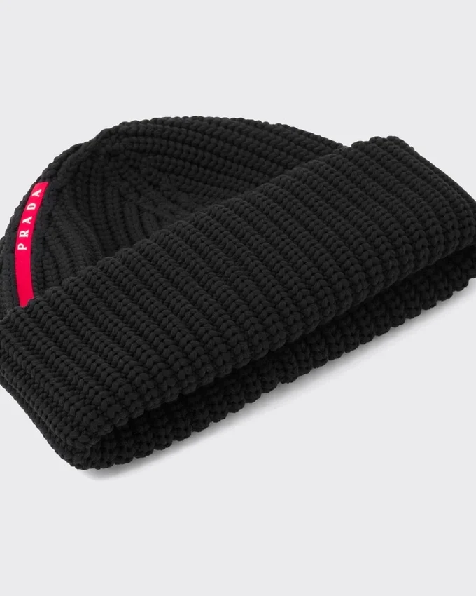 リサイクル糸を使用したテクニカルニット「Tec Recナイロン」製で、リブ編みのモチーフが施されたこのビーニーには、象徴的なプラダ リネア・ロッサのロゴが彩りを添えています。本製品は「Sea Beyond」教育プログラムの対象外となります。<!–メイン素材: